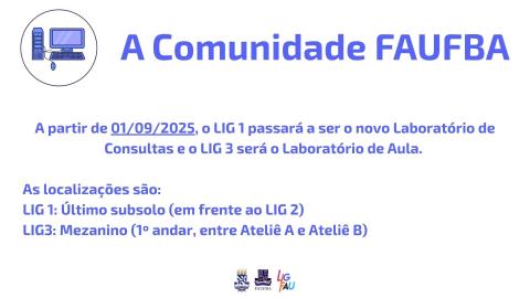 O Laboratório de Consultas LIG 3 será transferido para Laboratório de Aula. Este novo espaço acadêmico esta localizado no mezanino do prédio, entre o Ateliê A e o Ateliê B, no primeiro andar.