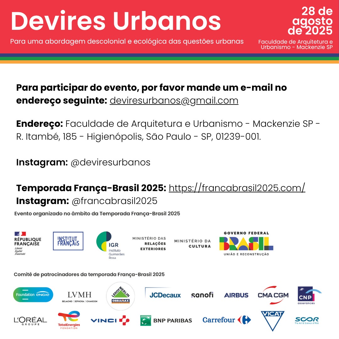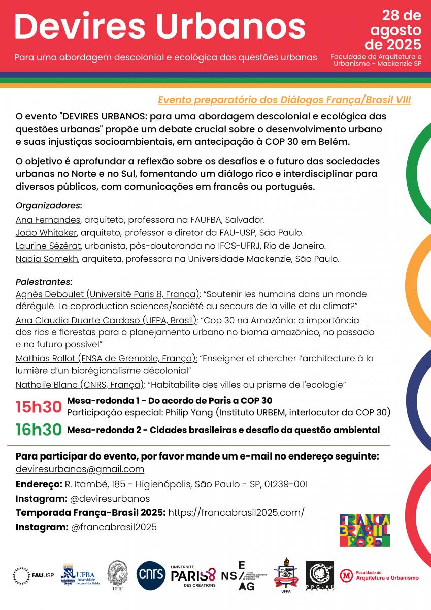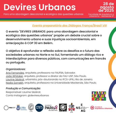 O evento "DEVIRES URBANOS: para uma abordagem descolonial e ecológica das questões urbanas", a ser realizado em São Paulo, no dia 28 de agosto, propõe um debate crucial sobre o desenvolvimento urbano e suas injustiças socioambientais, em antecipação à COP 30 em Belém. O objetivo é aprofundar a reflexão sobre os desafios e o futuro das sociedades urbanas no Norte e no Sul, fomentando um diálogo rico e interdisciplinar para diversos públicos, com comunicações em francês ou português.
