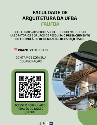 Com o objetivo de realizarmos a atualização do Plano de Ocupação e Desenvolvimento Físico da FAUFBA, estamos encaminhando o Formulário de Demandas de Espaço Físico para que seja preenchido por docentes, coordenadores(as) de laboratórios e de grupos de pesquisa.