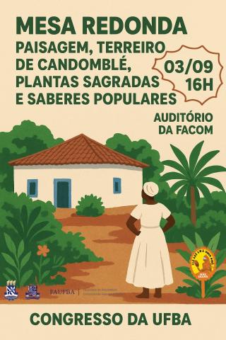 Por ocuparem áreas de alto valor ambiental, os terreiros de candomblé fazem frente ao cenário de expansão urbana desenfreado que promove o apagamento dos processos naturais e culturais da cidade e se tornam esmeraldas, pouco conhecidas e até marginalizadas, na paisagem das cidades. Os territórios de práticas de matrizes religiosas afro-brasileiras defendem a conservação da natureza como prática imperativa, sem mencionar o protagonismo de suas plantas sagradas como prática de cura e proteção religiosa. A proposta desta mesa é debater a condição e as transformações das paisagens ancestrais dos terreiros e seus saberes populares ao longo do tempo e os elementos que a compõem. Para tanto, convida a Yalorixá Diana de Oxum, fundadora da Associação de Terreiros da Bahia – Egbé Axé e do Ilê Axé Ewá Omin Niré, juntamente com a Doutoranda do PPGENF- UERJ, Lívia Maria da Silva Gonçalves, do Prof. e Diretor Fabio Velame da Faculdade de Arquitetura, da doutoranda Liane Monteiro, doutorando do PPGAU-UFBA, a discente Bruna dos Santos Azevedo e a com a mediação da Profa. Camila Gomes Sant’ Anna e o discente Kaique Mascarenhas.