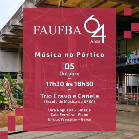 Em comemoração ao seu 64º aniversário, a FAUFBA convida para um final de tarde de "Música no Pórtico", dia 05/10, quinta, das 17h30 às 18h30.