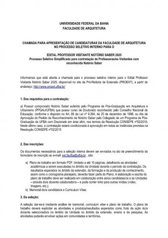 CHAMADA PARA APRESENTAÇÃO DE CANDIDATURAS DA FACULDADE DE ARQUITETURA NO PROCESSO SELETIVO INTERNO PARA O EDITAL PROFESSOR VISITANTE NOTÓRIO SABER 2025