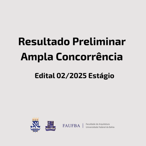 Enviado por carina em ter, 26/08/2025 - 18:34 Publicamos o resultado preliminar da ampla concorrência do Edital 02/2025 - Processo Seletivo para Estágio na FAUFBA, no link abaixo: Resultado ampla concorrência Idioma Português, Brasil