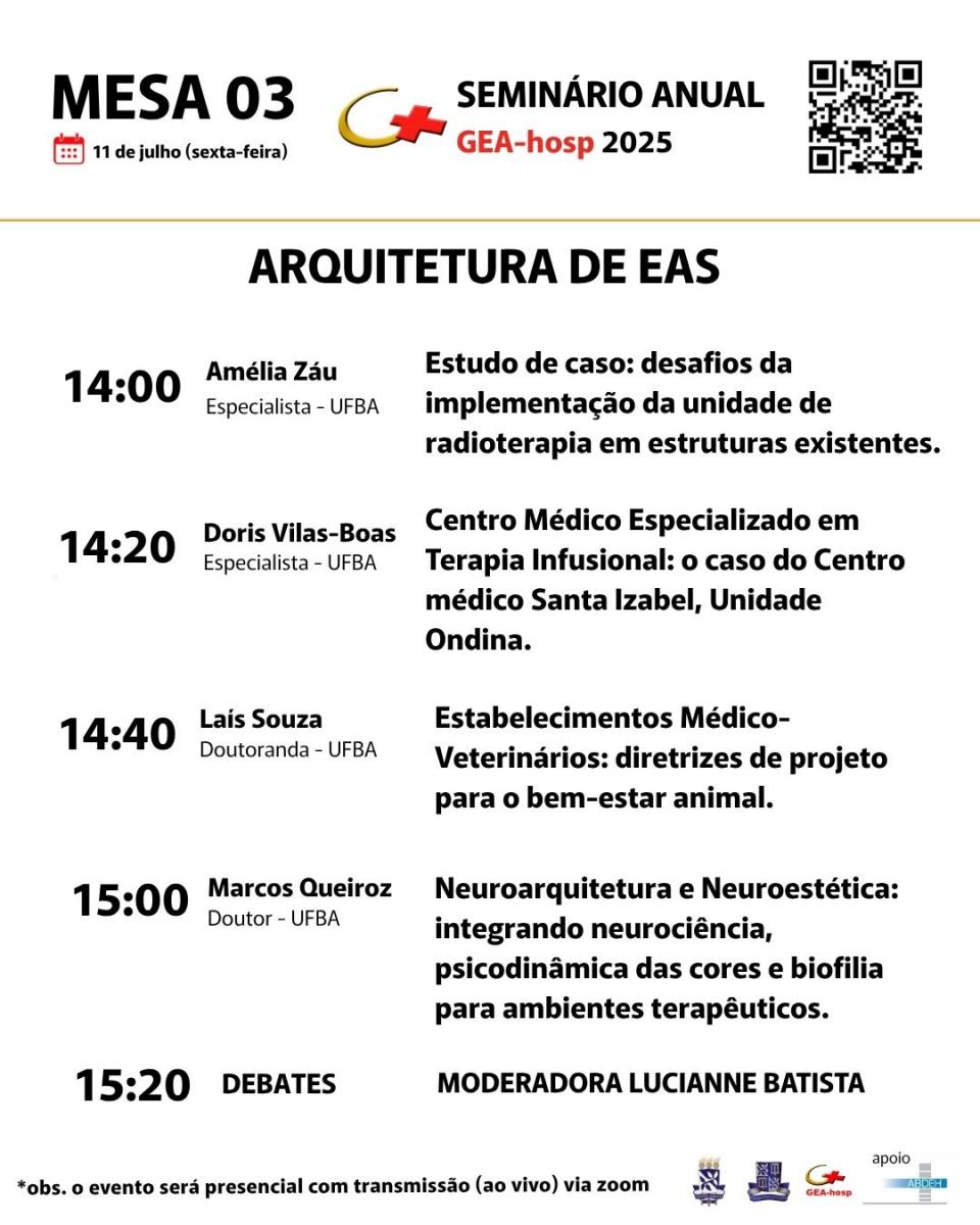 Este ano, o evento se propõe a ampliar o debate sobre sustentabilidade, inclusão e inovação nos espaços de cuidado, articulando experiências acadêmicas e práticas profissionais que dialogam com os desafios contemporâneos da arquitetura para a saúde.