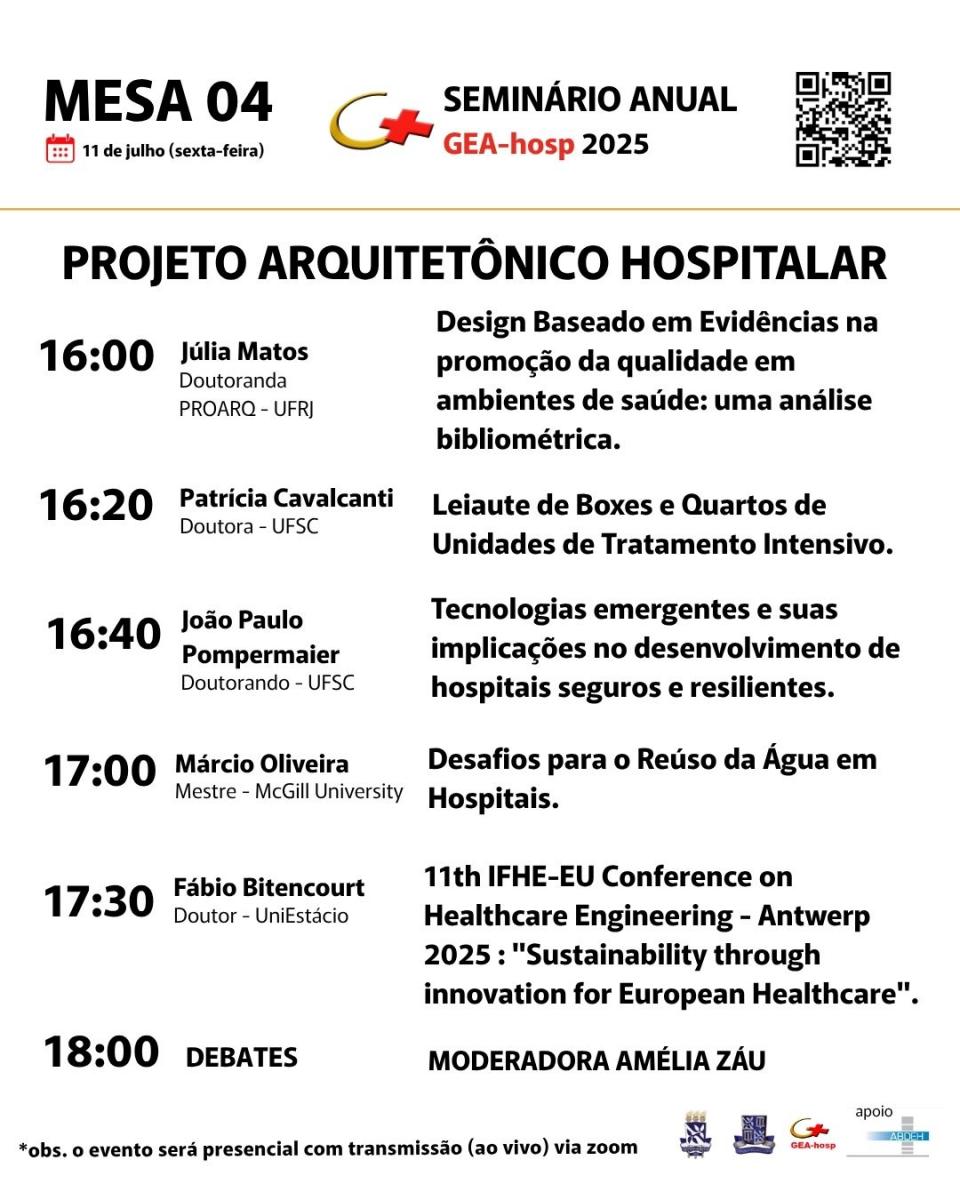O Grupo de Estudos em Arquitetura e Engenharia Hospitalar – GEA-hosp – convida a comunidade acadêmica, profissionais da saúde, arquitetura, engenharia e demais interessados nos temas do ambiente construído para a saúde, para participar de mais uma edição do seu tradicional seminário anual.