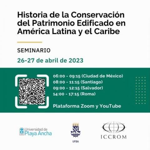 O evento acontecerá nos dias 26 e 27 de abril de 2023 das 9h às 12h15 (horário de Salvador) através da Plataforma Zoom e do canal do ICCROM no YouTube, com a participação como expositores de pesquisadores e profissionais do Brasil, Chile, Cuba, Equador, Guatemala, México, Paraguai e República Dominicana. Maiores informações e inscrições através do link: https://www.iccrom.org/es/events/segundo-seminario-historia-de-la-conser....